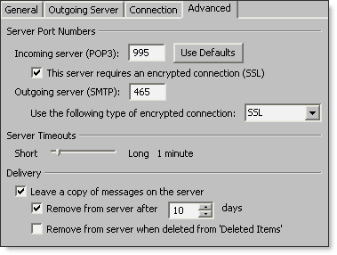 17.A POP connection normally removes the email messages from the server during download. If you would like to leave copies on the server, select the Leave a copy of messages on server check box. To avoid exceeding your account�s storage limits, indicate whether the server should delete messages after a certain number of days and/or delete messages when you manually delete them from the Deleted Items folder. We recommend a setting no shorter than 10 days and no longer than 90 days.